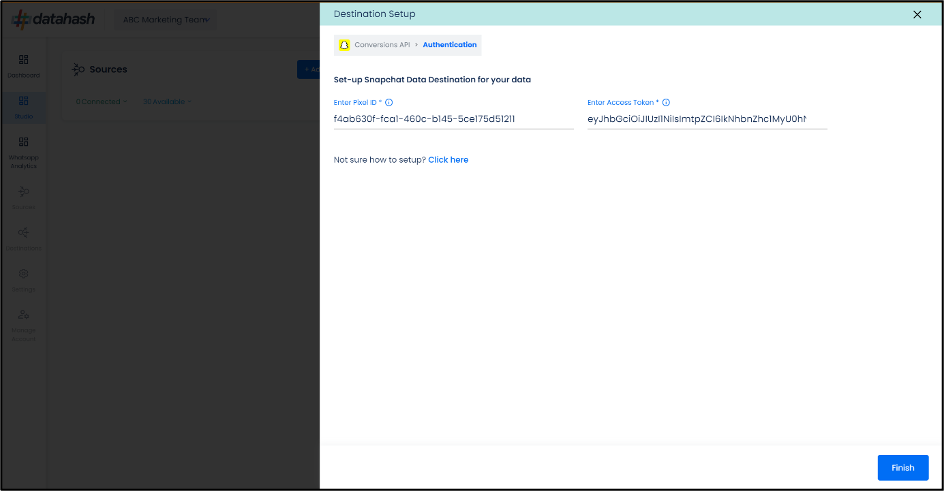 Provide the Pixel ID and the Access token of the Snapchat Business Account that you would like to integrate. Once added, click on Finish. Datahash will verify the provided credentials. Once verified, the set-up gets completed.
